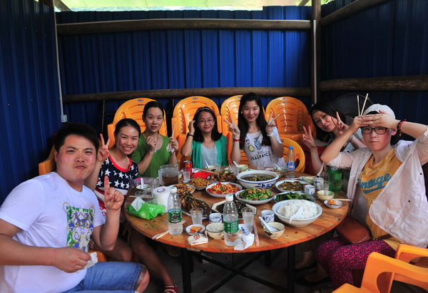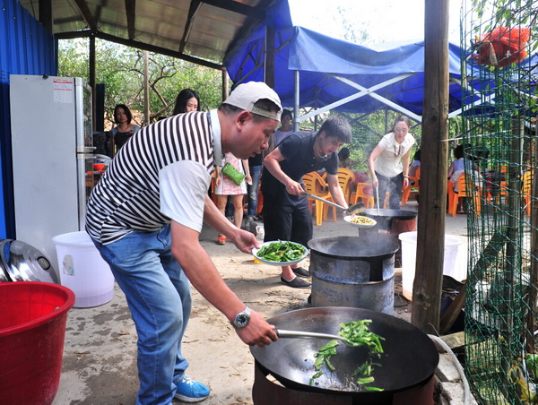 9日中午,28名通讯员经过3个小时的长途跋涉,抵达了广州从化溪头村,在这里,我们进行通讯员生存大挑战。通讯员野外生存大挑战,是今年通讯员活动特别设置的环节,目的在于增加通讯员的野外生活体验,短时间内快速增进各地通讯员之间的交流与互动,同时为当天下午的会议提前热身。通讯员们抵达后首先要解决吃饭问题。所有通讯员被分为三组,每组9~10人,他们被分到同等分量、未经处理的食材。生火、洗锅、洗菜、切菜、剁肉、炒菜......山林中升起袅袅炊烟,简陋的农庄里,一派热火朝天的场景。“自己动手,丰衣足食”,为解决共同的生存问题,平时原本交流不多的通讯员,在活动中充分发挥了分工协作的精神。短短一个小时内,一桌柴火烧制的原生态“农家乐”新鲜出炉。
