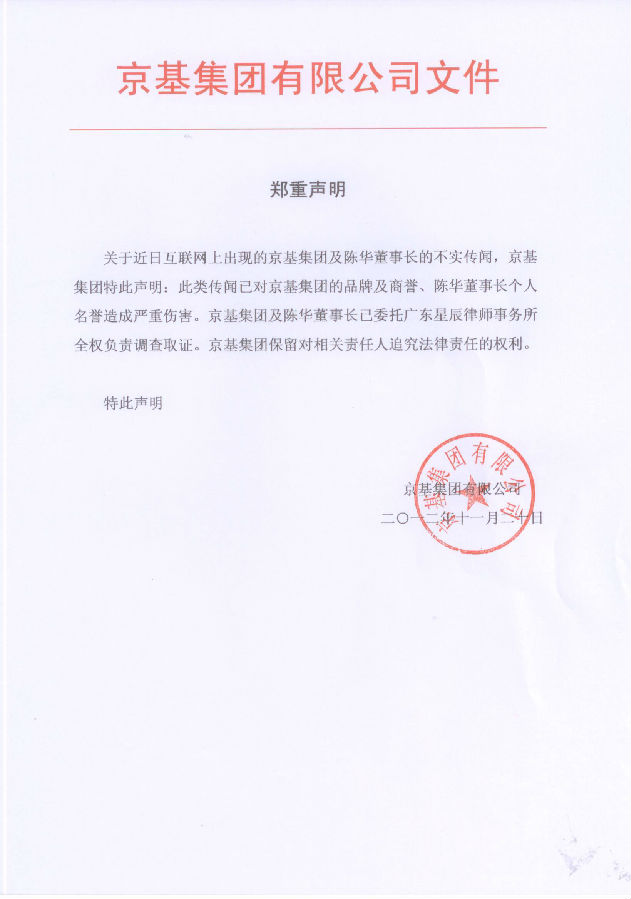 关于近日互联网上出现的京基地产及陈华董事长的不实传闻,京基地产特此声明:此类传闻已对京基地产的品牌及商誉、陈华董事长个人名誉造成严重伤害。京基地产及陈华董事长已委托广东星辰律师务所全权负责调查取证。京基地产保留对相关责任人追究法律责任的权利。