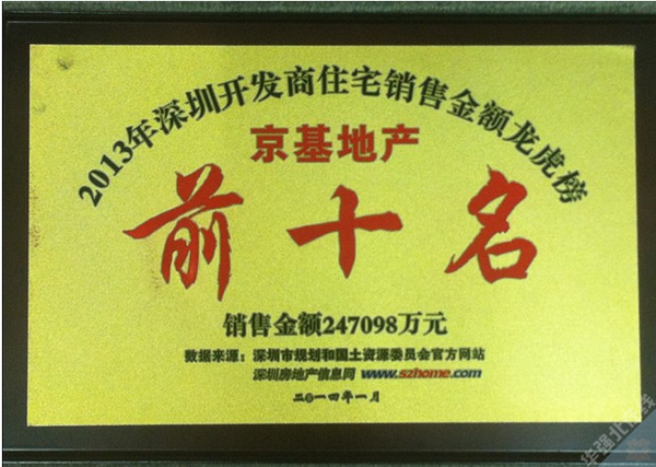 2014年1月14日晚,深圳房地产信息网主办的“2013深圳地产龙虎榜颁奖典礼”在深圳会展中心的梅花厅盛大举行,深圳及珠三角地区600多位地产精英,知名地产经纪公司代表等应邀而来,共同见证了2013年深圳地产界年终盛事。京基地产荣登深圳开发商龙虎榜TOP10, “双子星”京基·滨河时代和京基·云景梧桐均璀璨上榜。