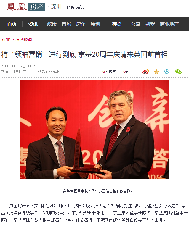 12年后,京基迎来20周年庆,这一次,陈华请来英国前首相布朗助阵,似有将“领袖营销”进行到底的气势。