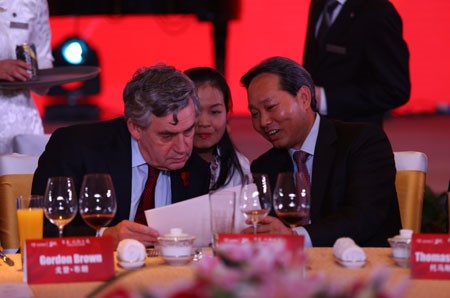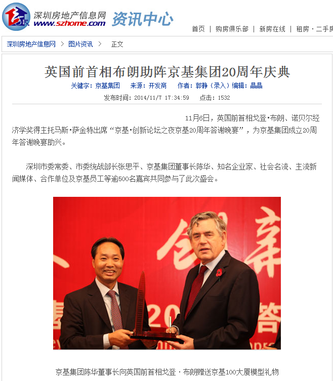11月6日,英国前首相戈登?布朗、诺贝尔经济学奖得主托马斯?萨金特出席“京基?创新论坛之夜京基20周年答谢晚宴”,为京基集团成立20周年答谢晚宴助兴。