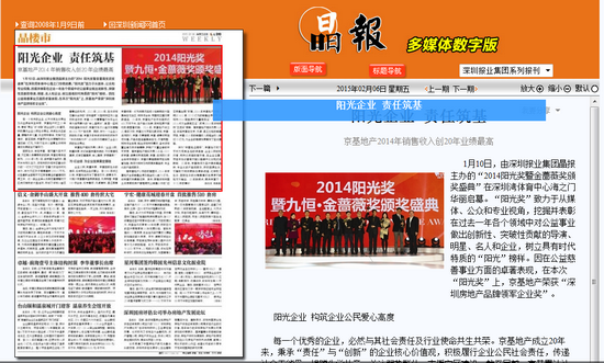 1月10日,由深圳报业集团晶报主办的“2014阳光奖暨金蔷薇奖颁奖盛典”在深圳湾体育中心海之门华丽启幕。“阳光奖”致力于从媒体、公众和专业视角,挖掘并表彰在过去一年各个领域中对公益事业做出创新性、突破性贡献的导演、明星、名人和企业,树立具有时代特质的“阳光”榜样。因在公益慈善事业方面的卓著表现,在本次“阳光奖”上,京基地产荣获“深圳房地产品牌领军企业奖”。
