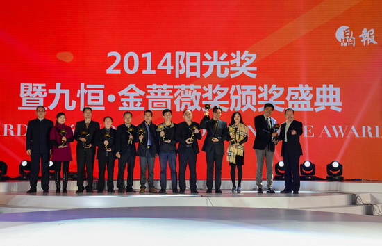 1月10日晚,“2014阳光奖暨金蔷薇奖颁奖盛典”在深圳湾体育中心海之门华丽启幕,香港著名导演王家卫获“阳光奖年度最佳导演奖”,马苏获“阳光艺人奖”,京基地产荣获“阳光企业——深圳房地产品牌领军企业”奖。深圳市副市长吴以环、深圳市委副秘书长胡谋、深圳市委宣传部副部长刘佳晨、深圳市外宣办主任韩望喜等政府领导;香港著名导演王家卫、博纳影业集团总裁于冬、深圳报业集团社长陈寅、深圳出版发行集团总经理尹昌龙、深圳报业集团总编辑宣柱锡、深圳广电集团副总编李也平、深圳特区报总编辑胡恒芳、深圳晚报总编辑丁时照、晶报总编辑胡洪侠等现场为获奖名人和单位颁奖,京基地产副总裁熊伟先生现场领取奖项。