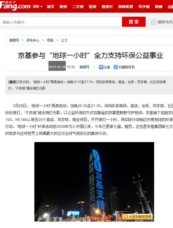 当晚,除旗下物业齐齐参与熄灯活动外,京基集团还通过官方微博、微信公众号、租户邮件、客户会、业主群等渠道,呼吁大家积极响应爱护地球、共同参与环保活动。京基陈华董事长高度重视该项活动并表示:我们通过地球一小时活动,为环保事业做出努力,通过个人的小行为来改变大世界,企业也可以通过改变业务开展方式,使世界更加环保。从事环保事业多年的深圳某环保专家表示,环保不是一个人的事,京基100等地标建筑的身体力行,对全民环保有很好的引领和激发作用。
