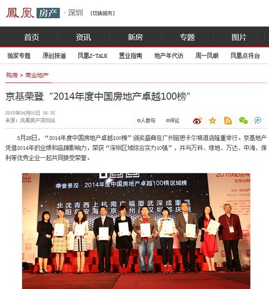3月26日,“2014年度中国房地产卓越100榜”颁奖盛典在广州丽思卡尔顿酒店隆重举行。京基地产凭借2014年的业绩和品牌影响力,荣获“深圳区域综合实力10强”,并与万科、绿地、万达、中海、保利等优秀企业一起共同接受荣誉。