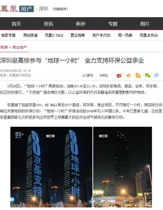 京基旗下包括京基100、KK MALL等近20个酒店、写字楼、商业项目,齐齐熄灯一小时,用实际行动响应关爱地球的环保行动。“地球一小时”环保活动自2009年引入中国以来,今年已是第七届,这也是京基集团第七次积极参与这项世界上规模最大的应对全球气候变化的集体行动。