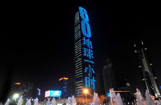 (3月28日晚,京基100幕墙LED广告平台显现“京基支持地球一小时”滚动字幕)