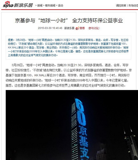 当晚,除旗下物业齐齐参与熄灯活动外,京基集团还通过官方微博、微信公众号、租户邮件、客户会、业主群等渠道,呼吁大家积极响应爱护地球、共同参与环保活动。京基陈华董事长高度重视该项活动并表示:我们通过地球一小时活动,为环保事业做出努力,通过个人的小行为来改变大世界,企业也可以通过改变业务开展方式,使世界更加环保。从事环保事业多年的深圳某环保专家表示,环保不是一个人的事,京基100等地标建筑的身体力行,对全民环保有很好的引领和激发作用。