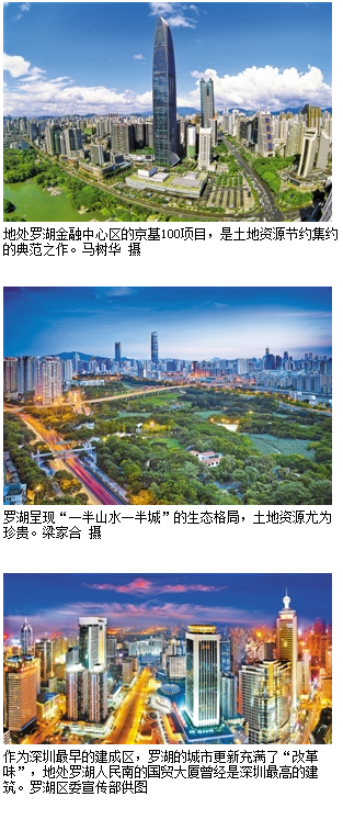 作为中心城区的罗湖是深圳最早开发的城区,最先遭遇“四个难以为继”,土地资源难以为继、发展空间受限的困境尤为突出。辖区78.75平方公里的面积有近一半为深圳水源保护区和梧桐山森林保护区,可建设用地非常有限。为了在有限的土地资源上实现更大的发展,罗湖区深化“创新开路、质量至上”的理念,深入推进“一中心两基地”建设,加快城市更新、土地整备,纵深挖潜存量土地潜力,在规划融合推动城市建设、土地市场配置、土地二次开发利用、土地利用发展方式转变推动产业转型升级、地下空间开发利用等方面不断探索,构建了高度城市化地区土地节约集约利用的新模式与新机制,为深圳兄弟区和其他城市的建设发展提供了新鲜经验。