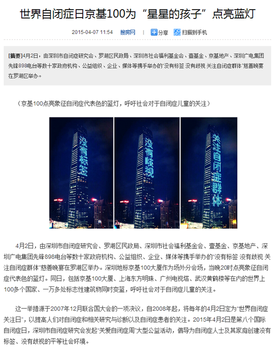 4月2日,由深圳市自闭症研究会、罗湖区民政局、深圳市社会福利基金会、壹基金、京基地产、深圳广电集团先锋898电台等数十家政府机构、公益组织、企业、媒体等携手举办的“没有标签 没有歧视 关注自闭症群体”慈善晚宴在罗湖区举办。深圳地标京基100大厦作为场外分会场,当晚20时点亮象征自闭症代表色的蓝灯。同日,包括京基100大厦、上海东方明珠、广州电视塔、武汉黄鹤楼等在内的世界上100多个国家、一万多处标志性建筑物同时变蓝,呼吁社会对于自闭症儿童的关注。