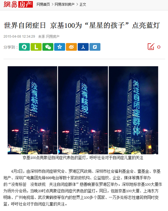 当晚20时,高441.8米的京基100幕墙LED灯光平台闪现“关注自闭症群体”蓝色字样,“自闭症周”活动由此展开。仪式上,深圳市自闭症研究会创始人廖艳晖女士动情致辞:“‘星星的孩子’(指自闭症孩子)不应该被贴上标签,更不应该被歧视,我们希望通过一系列活动、一些标志性建筑的参与来推动公众对自闭症人士的了解与关注。”因对“世界自闭症日”相关活动的积极响应参与及一贯以来的公益慈善作为,京基地产被授予“第十届关爱自闭症周-爱心企业”荣誉奖项。谈到京基100参与亮灯仪式,深圳市自闭症研究会某工作人员向记者透露:“因为是深圳地标级建筑,我们在邀请京基100参加亮灯仪式的时候曾有些犹豫。但后来才得知,自2011年建成并投入使用以来,京基100幕墙灯光平台先后参与了多项慈善公益事业,所刊登广告有7成是公益广告,所以我们这次公益活动的合作也非常成功。”