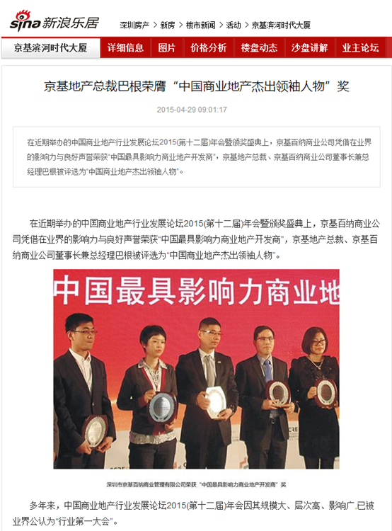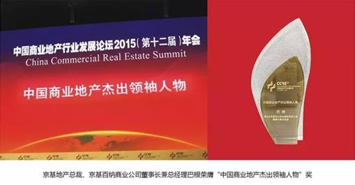 在近期举办的中国商业地产行业发展论坛2015(第十二届)年会暨颁奖盛典上,京基百纳商业公司凭借在业界的影响力与良好声誉荣获“中国最具影响力商业地产开发商”,京基地产总裁、京基百纳商业公司董事长兼总经理巴根被评选为“中国商业地产杰出领袖人物”。