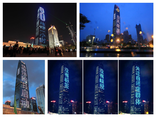 作为深圳最具代表性的地标建筑,京基100已经不是第一次通过441.8米的幕墙LED灯光与市民“对话”和“示爱”。2013年6月,在“深圳温度”大型城市公益活动中,京基100化身全球最大的“温度计”,为广东省扶贫济困日、深圳市慈善月、慈善日启动仪式暨第二届慈展会活动启动宣传造势,呼吁企业家们奉献爱心,京基集团更是累计向深圳市慈善会、第二届中国慈展会捐赠近千万元的京基100幕墙广告资源,受到深圳市委市政府的一致褒扬。