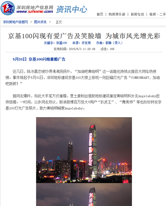 近日,记者联系负责京基100楼体广告运营的京基地产品牌管理中心相关负责人询问此事,该人士表示,网友盛传的“黄晓明借京基100喊爱”实则是一个“美丽的误会”,这是深圳卫视为其5月31日开播的国内首档明星婚礼真人秀《加油吧新郎!》做的宣传,选择在京基100投放广告,也是看中了京基100作为深圳地标的影响力、物理高度的视距辐射力、广告平台的话题承载力等因素。