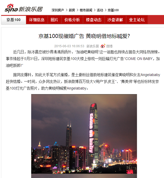 据网友爆料,如此大手笔方式催婚,是土豪粉丝借助地标建筑催促黄晓明和女友Angelababy赶快结婚。一时间,众多网友热议,新浪微博百万级大V用户“扒皮王”、“舞美师”等也纷纷转发京基100灯光广告照片,助力黄晓明喊爱Angelababy。