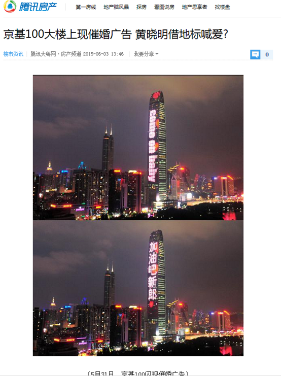 近日,记者联系负责京基100楼体广告运营的京基地产品牌管理中心相关负责人询问此事,该人士表示,网友盛传的“黄晓明借京基100喊爱”实则是一个“美丽的误会”,这是深圳卫视为其5月31日开播的国内首档明星婚礼真人秀《加油吧新郎!》做的宣传,选择在京基100投放广告,也是看中了京基100作为深圳地标的影响力、物理高度的视距辐射力、广告平台的话题承载力等因素。