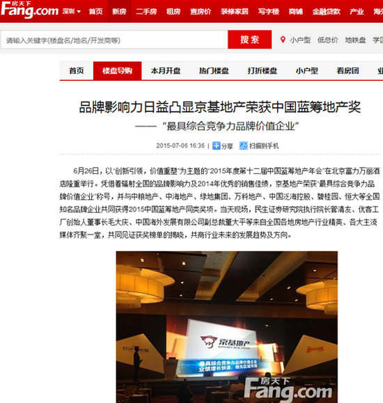6月26日,以“创新引领,价值重塑”为主题的“2015年度第十二届中国蓝筹地产年会”在北京富力万丽酒店隆重举行。凭借着辐射全国的品牌影响力及2014年优秀的销售佳绩,京基地产荣获“最具综合竞争力品牌价值企业”称号,并与中粮地产、中海地产、绿地集团、万科地产、中国泛海控股、碧桂园、恒大等全国知名品牌企业共同获得2015中国蓝筹地产同类奖项。当天现场,民生证券研究院执行院长管清友、优客工厂创始人董事长毛大庆、中国海外发展有限公司副总裁董大平等来自全国各地房地产行业精英、各大主流媒体齐聚一堂,共同见证获奖榜单的揭晓,共商行业未来的发展趋势及方向。