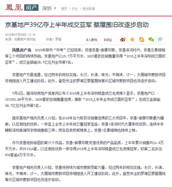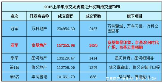 7月1日,据深圳房地产信息网公布《2015年上半年深圳楼盘成交龙虎榜》显示,京基地产以157252.96平方米、1625套的总销售量佳绩,摘取“2015上半年全市成交面积亚军”;总成交金额逾38.7亿位列全市第7名。