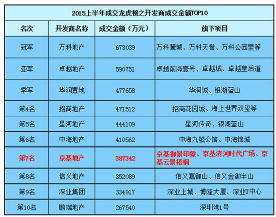 2015年楼市“中考”已经结束,京基地产捷报频传。2015年上半年,京基地产销售佳绩斐然。在全国范围内跻身“2015上半年中国房地产企业销售百强排行榜第94位”。在深圳获得“2015上半年全市成交面积亚军”、“2015年总成交金额全市前十(第7名)”。