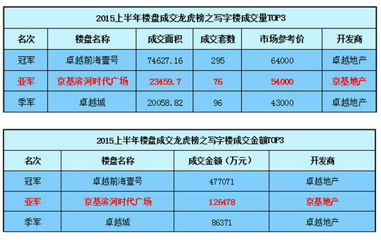 2015年上半年,京基3大项目京基?御景印象、京基滨河时代、京基云景梧桐持续热销。7月1日,根据权威网站深圳房地产信息网公布《2015年上半年深圳楼盘成交龙虎榜》显示,京基地产以157252.96平方米、1625套的总销售量佳绩,摘取“2015上半年全市成交面积亚军”;总成交金额逾38.7亿位列全市第7名,同时跻身新浪房产“2015上半年中国房地产企业销售百强排行榜第94位”。在2015年合力斩获该销售佳绩的三大项目中,京基?御景印象最为耀眼,以压倒性的优势,一举登上全市上半年成交量冠军宝座。京基?滨河时代大厦表现优异,连续半年蝉联深圳高端写字楼销售前三甲。而在各类权威榜单上,京基?云景梧桐也持续上榜。