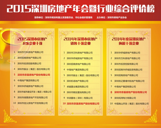 在发布的2015深圳房地产开发企业综合实力评价结果中,京基地产以优异的销售佳绩和综合影响力,荣膺“2015深圳房地产开发十强企业(第五名)”、“2015(2014)深圳房地产纳税十强企业”、“2015深圳房地产销售十强企业”光荣称号。其中,在颁布的地产开发两百强榜单中,京基地产以前五名的绩优排名,远超中海地产集团、华侨城地产、金地集团、中粮地产、华润置地等房地产开发国企和全国一线房地产开发企业。