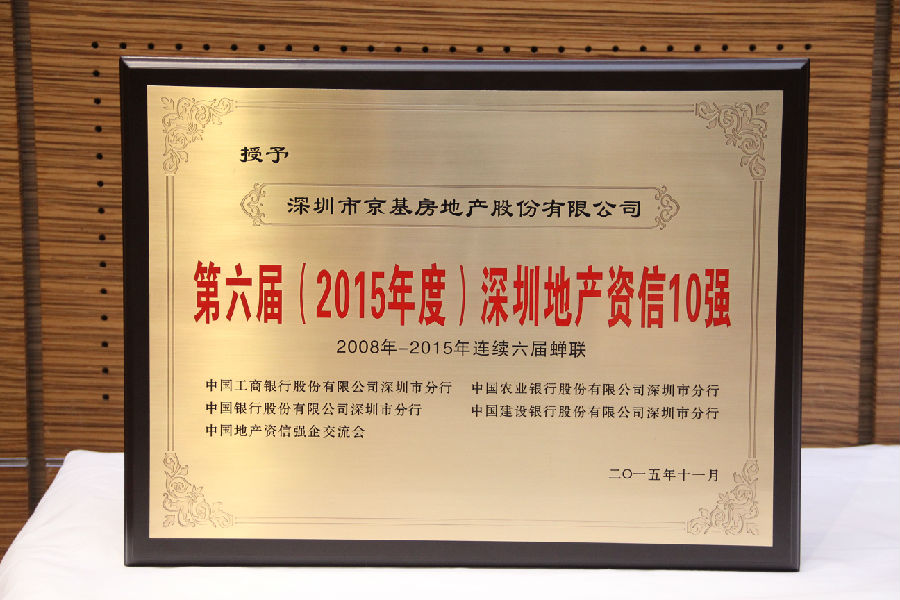 11月27日,“资·信”地产金融峰会暨“第六届(2015年度)深圳地产资信10强”颁奖典礼在阳光酒店举行。京基地产与万科、中海、金地、卓越、绿景、中信等10家卓著房企荣获第六届(2015年度)深圳地产资信10强的荣誉称号。这是京基自2008年来连续六届获得这一荣誉称号。