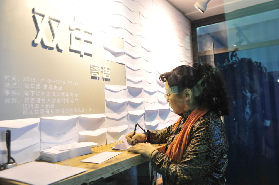 值得一提的是,现场还别具匠心地设计了两个互动环节。一个是集装箱外墙上用木板制作的红色“京”字样式的九宫格,参观者可用手随意移动、组合出新的形状。另一个是集装箱内的“双年展寄语”,仅仅是铺满整个墙面的信封设计就足以让人驻足,参观者可以写下心底对双年展、对京基集团、乃至对深圳的寄语投至邮箱中,还有机会获得一份神秘的礼物。