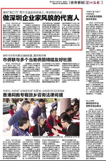 日前,以“传承、创新、发展”为主题的深圳“创二代”青年企业家座谈会在五洲宾馆深圳厅举行。市委常委、统战部长林洁出席座谈会,并和来自全市不同领域的60多名“创二代”青年企业家就如何围绕十八届五中全会提出的五大发展理念,结合自身发展进行了座谈。林洁寄望“创二代”青年企业家们,继承老一辈企业家爱党爱国、艰苦创业的优良传统,激扬青春梦想,共创深圳美好未来。