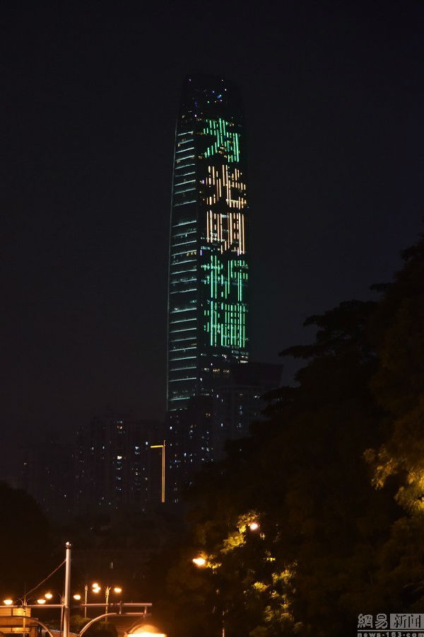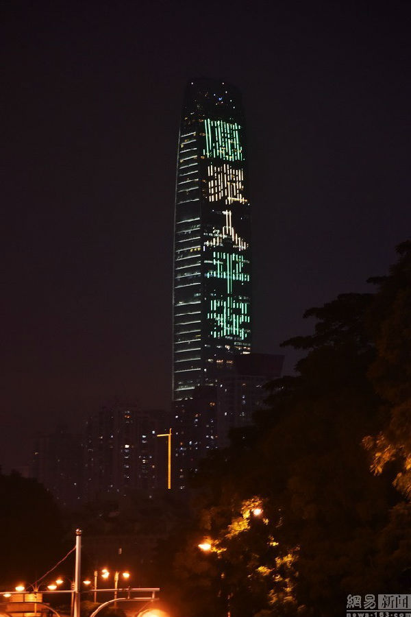 2015年12月21日晚,深圳地标建筑京基100大厦外墙亮灯。