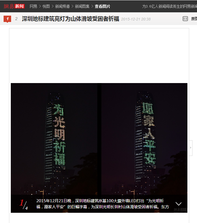 2015年12月21日晚,深圳地标建筑京基100大厦外墙LED打出“为光明祈福,愿家人平安”的巨幅字幕,为深圳光明长圳村山体滑坡受困者祈福。东方IC