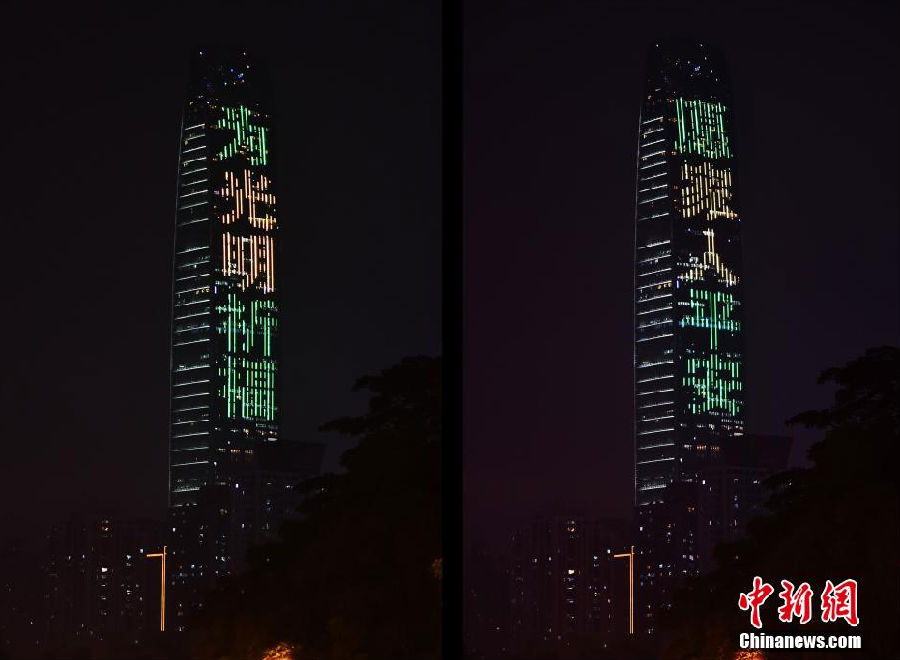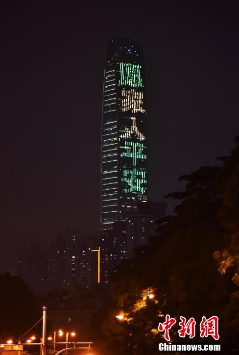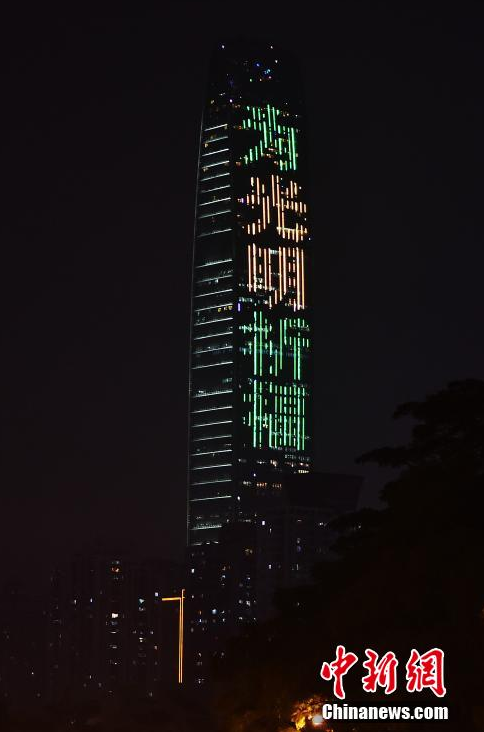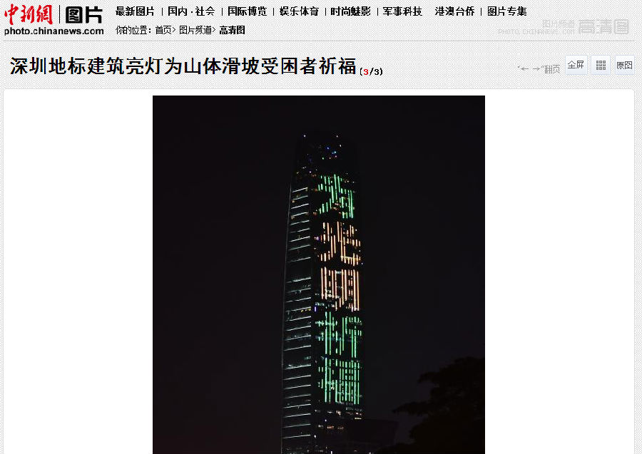 【中新网】深圳地标建筑亮灯为山体滑坡受困者祈福