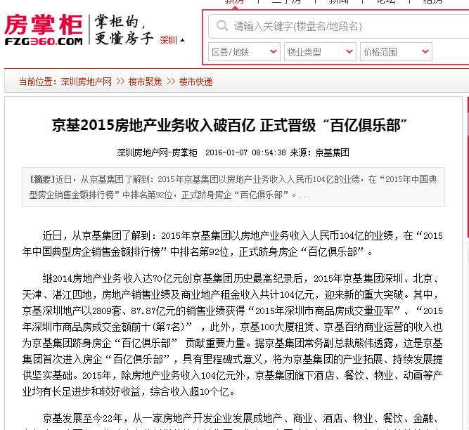 近日,从京基集团了解到:2015年京基集团以房地产业务收入人民币104亿的业绩,在“2015年中国典型房企销售金额排行榜”中排名第92位,正式跻身房企“百亿俱乐部”。