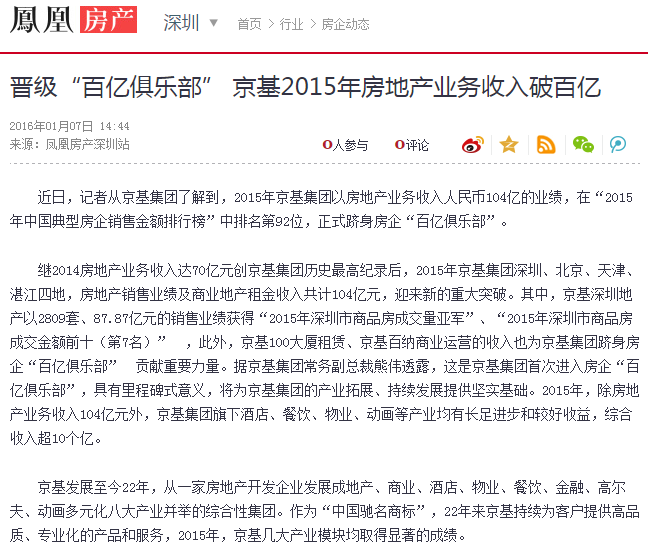 近日,记者从京基集团了解到,2015年京基集团以房地产业务收入人民币104亿的业绩,在“2015年中国典型房企销售金额排行榜”中排名第92位,正式跻身房企“百亿俱乐部”。