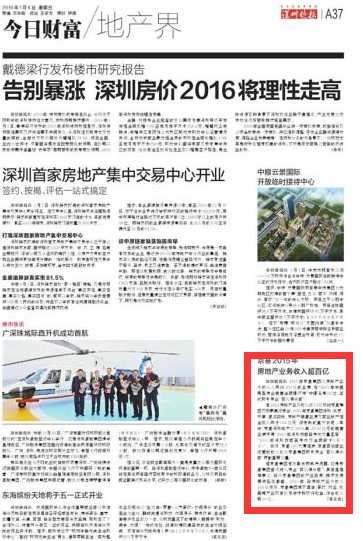 深圳晚报讯 2015年京基集团以房地产业务收入人民币104亿的业绩,在“2015年中国典型房企销售金额排行榜”中排名第92位,正式跻身房企“百亿俱乐部”。
