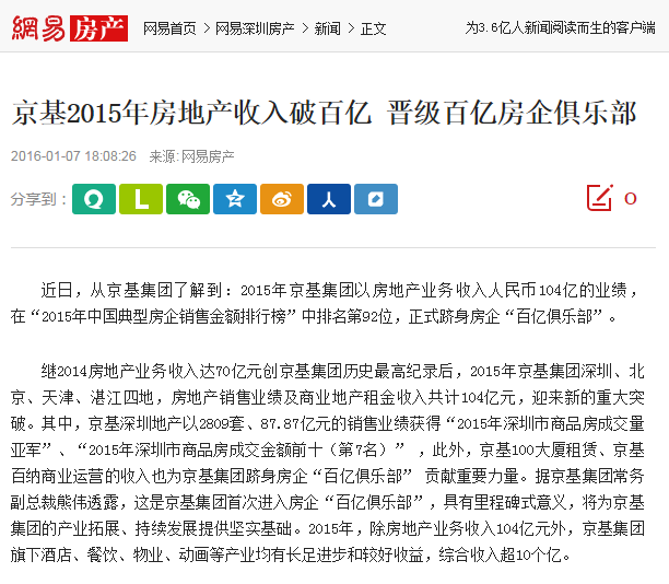 近日,从京基集团了解到:2015年京基集团以房地产业务收入人民币104亿的业绩,在“2015年中国典型房企销售金额排行榜”中排名第92位,正式跻身房企“百亿俱乐部”。