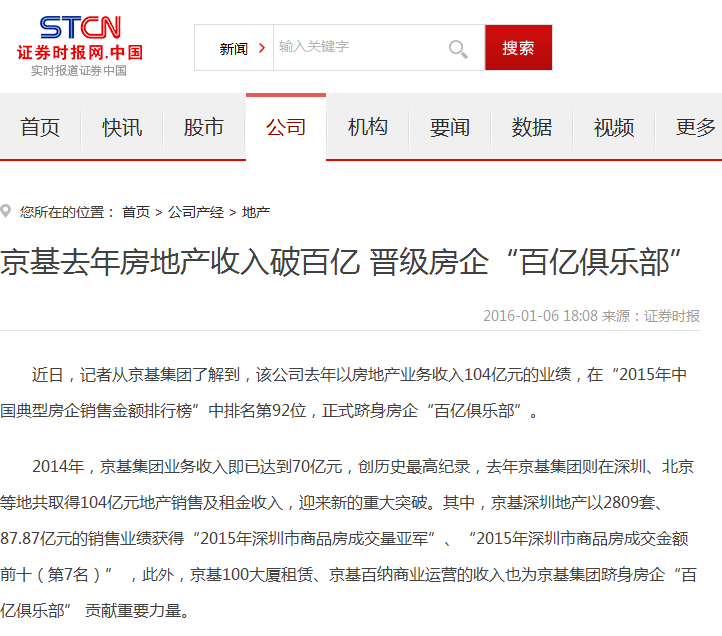 近日,记者从京基集团了解到,该公司去年以房地产业务收入104亿元的业绩,在“2015年中国典型房企销售金额排行榜”中排名第92位,正式跻身房企“百亿俱乐部”。