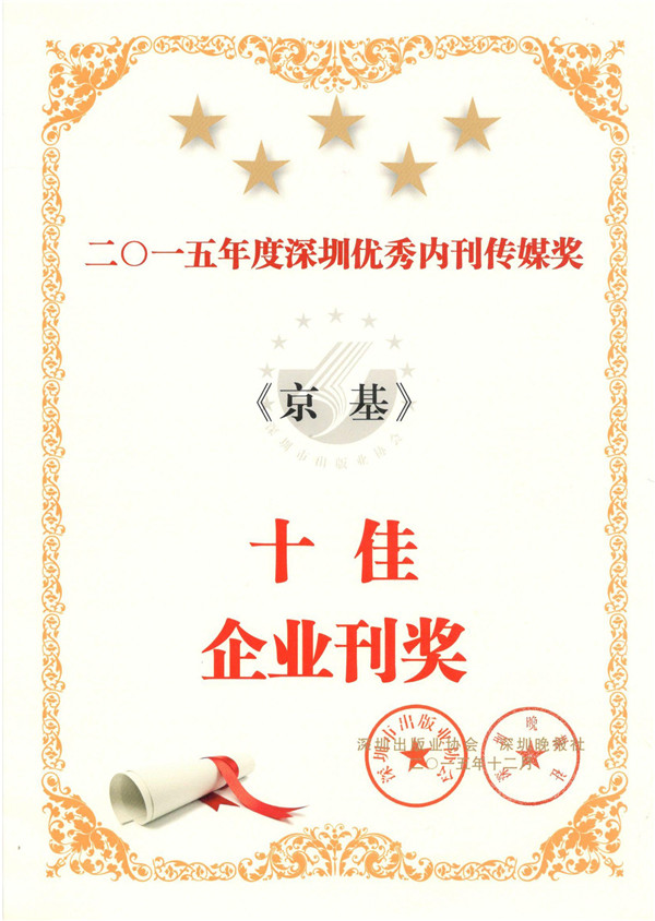 2015年12月17日,2015年度“深圳内刊界学习交流大会暨内刊传媒奖”颁奖大会在山西太原召开,《京基》期刊在120多家参评企业内刊中脱颖而出,荣获“2015年度优秀内刊传媒十佳企业”内刊大奖,并在1200多篇参评作品中摘得“好封面”一等奖以及“好卷首”二等奖两个奖项。