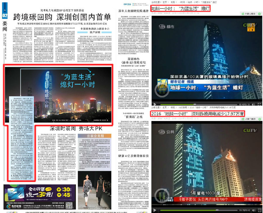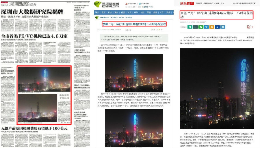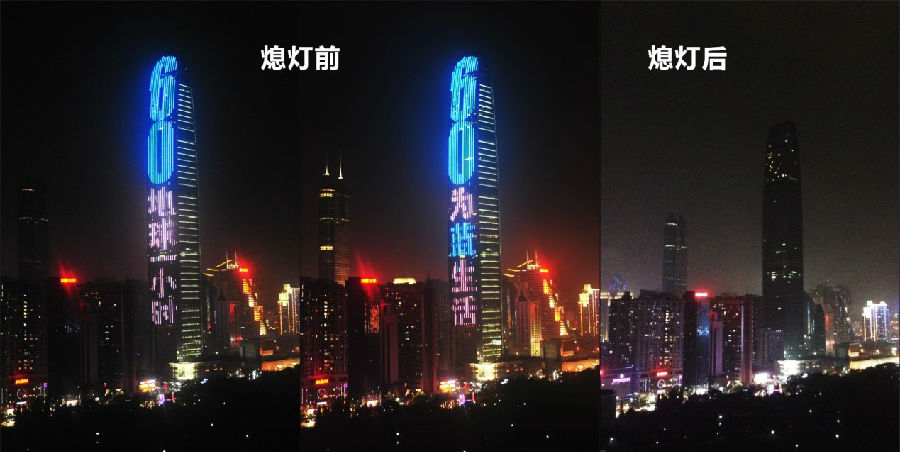 3月19日20:30,京基100大厦以身作则,在发出“为蓝生活 CONSUME LESS ENJOY MORE 京基全力支持地球一小时”京基式号召后熄灯,“为”蓝行动