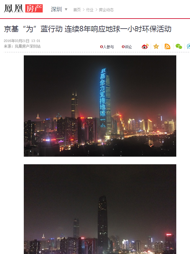 2016年3月19日20:30,高441.8米的深圳地标京基100大厦熄灯一小时, 积极响应以“为”蓝生活为主题的2016地球一小时活动。据悉,这是京基集团旗下各项目第8年响应地球一小时环保活动。