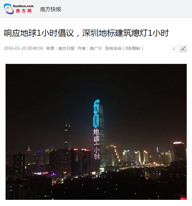 3月19日当晚,深圳高441.8米的地标建筑京基100大厦在晚间8:30分开始熄灯一小时,这是深圳该大楼响应世界自然基金会倡导而举行的“地球一小时”活动。