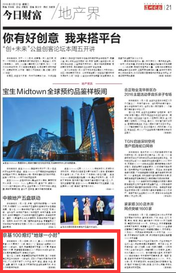 3月19日晚8点30分,高441.8米深圳地标京基100大厦熄灯一小时,响应以“为”蓝生活为主题的2016地球一小时活动。据悉,京基集团旗下京基100大厦、京基滨河时代大厦、京基瑞吉酒店等近20个项目也参与到活动中,这也是京基集团连续8年响应该活动。