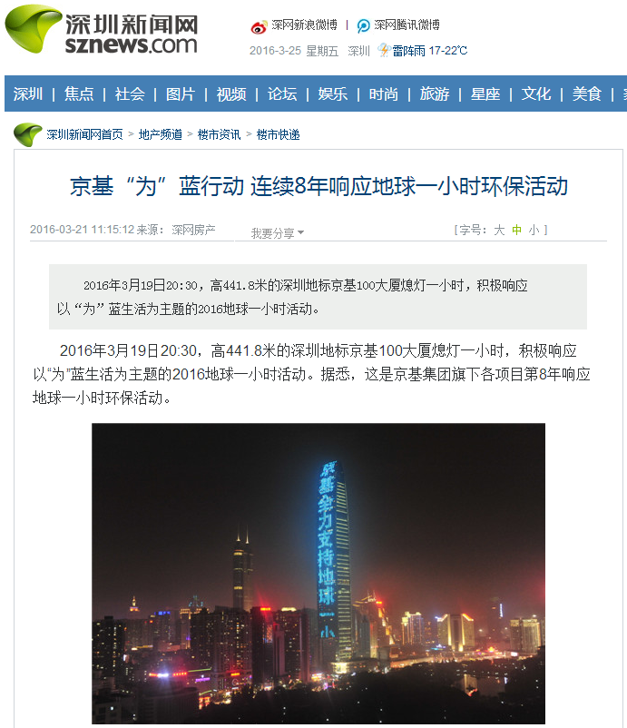 2016年3月19日20:30,高441.8米的深圳地标京基100大厦熄灯一小时,积极响应以“为”蓝生活为主题的2016地球一小时活动。据悉,这是京基集团旗下各项目第8年响应地球一小时环保活动。