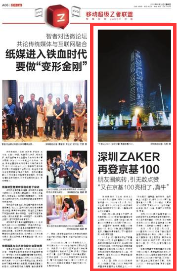 去年8月20日,正值七夕佳节,深圳晚报和ZAKER“联姻”推出融媒体平台深圳ZAKER。当晚7时至9时,京基100大厦楼体9次闪现“下载ZAKER 读懂深圳”的字样,每隔20分钟播放一次,每次1分钟,南北两面同步显示,炫酷的场景惊艳到了不少围观市民,并引爆朋友圈。