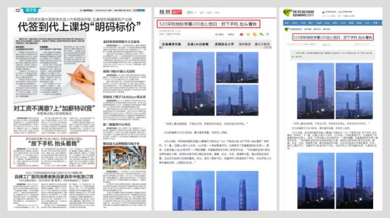 5月20日晚,深圳地标建筑京基100幕墙灯光发出“520 不做低头族 放下手机 抬头看我”的呼吁。《南方日报》、《深圳商报》、《深圳晚报》、《晶报》、《深圳都市报》等多家省级媒体、深圳主流媒体,以及大粤网、深圳新闻网、深圳房地产信息网、凤凰房产、网易房产、新浪房产等多家门户网站纷纷报道。