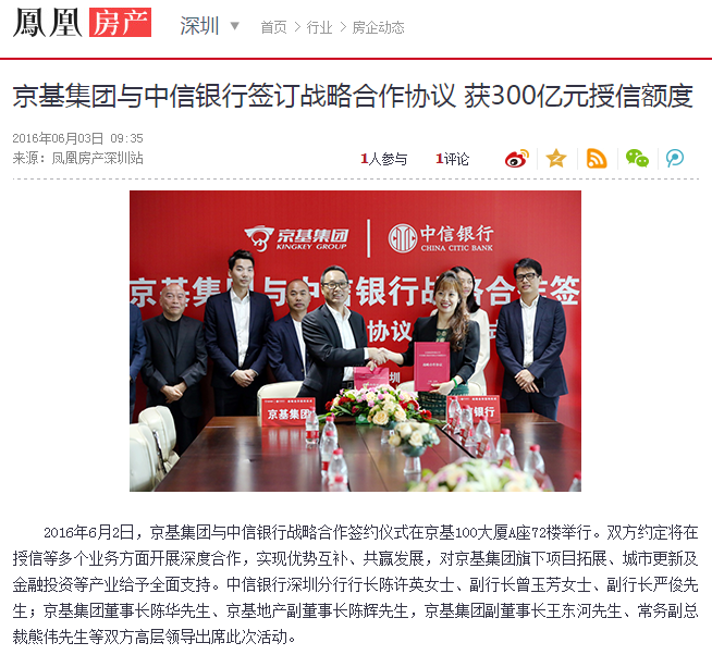 2016年6月2日,京基集团与中信银行战略合作签约仪式在京基100大厦A座72楼举行。双方约定将在授信等多个业务方面开展深度合作,实现优势互补、共赢发展,对京基集团旗下项目拓展、城市更新及金融投资等产业给予全面支持。中信银行深圳分行行长陈许英女士、副行长曾玉芳女士、副行长严俊先生;京基集团董事长陈华先生、京基地产副董事长陈辉先生,京基集团副董事长王东河先生、常务副总裁熊伟先生等双方高层领导出席此次活动。