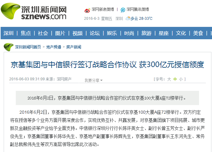 2016年6月2日,京基集团与中信银行战略合作签约仪式在京基100大厦A座72楼举行。双方约定将在授信等多个业务方面开展深度合作,实现优势互补、共赢发展,对京基集团旗下项目拓展、城市更新及金融投资等产业给予全面支持。中信银行深圳分行行长陈许英女士、副行长曾玉芳女士、副行长严俊先生;京基集团董事长陈华先生、京基地产副董事长陈辉先生,京基集团副董事长王东河先生、常务副总裁熊伟先生等双方高层领导出席此次活动。