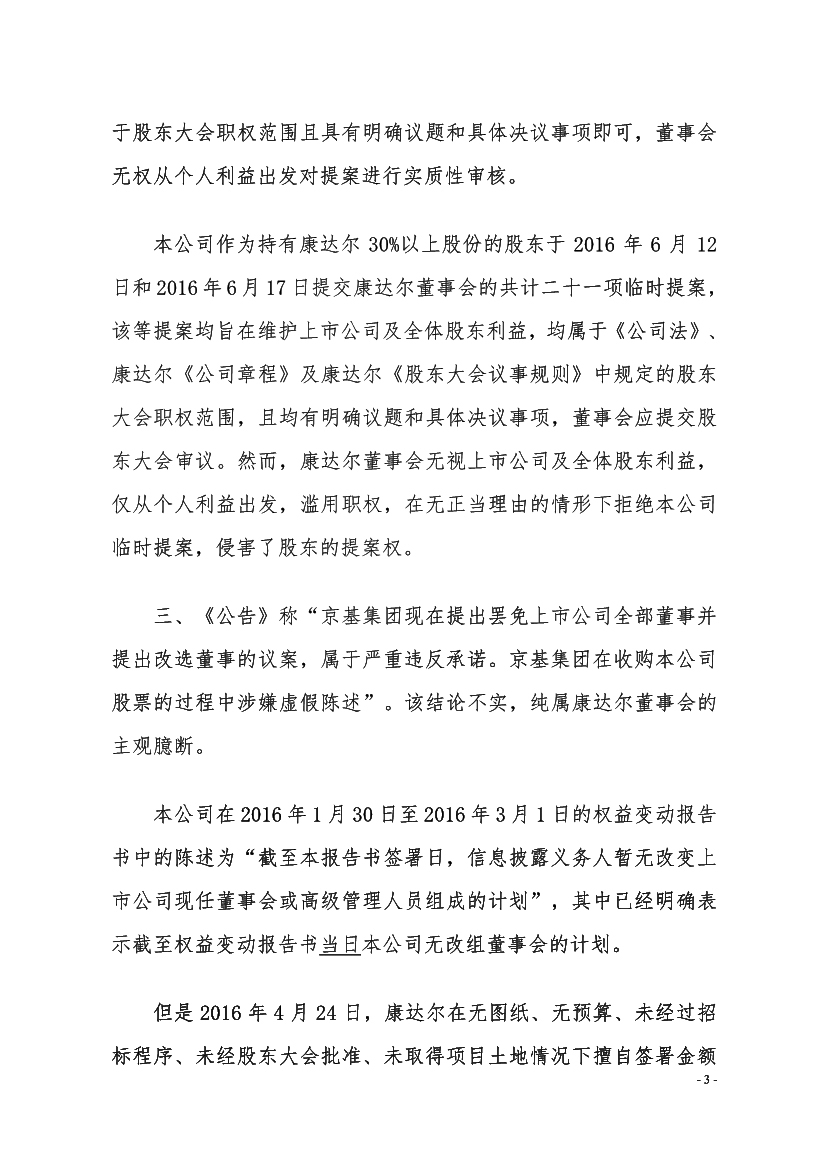 三、《公告》称“京基集团现在提出罢免上市公司全部董事并提出改选董事的议案,属于严重违反承诺。京基集团在收购本公司股票的过程中涉嫌虚假陈述”。该结论不实,纯属康达尔董事会的主观臆断。
