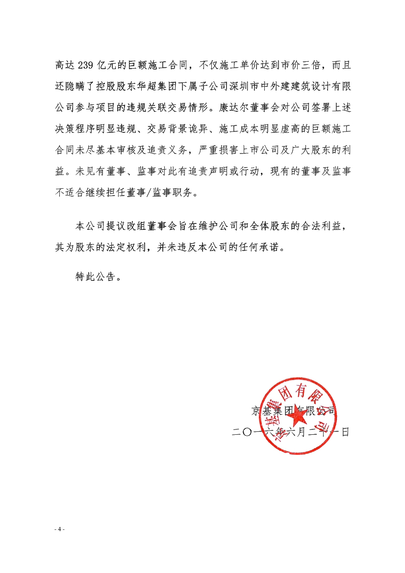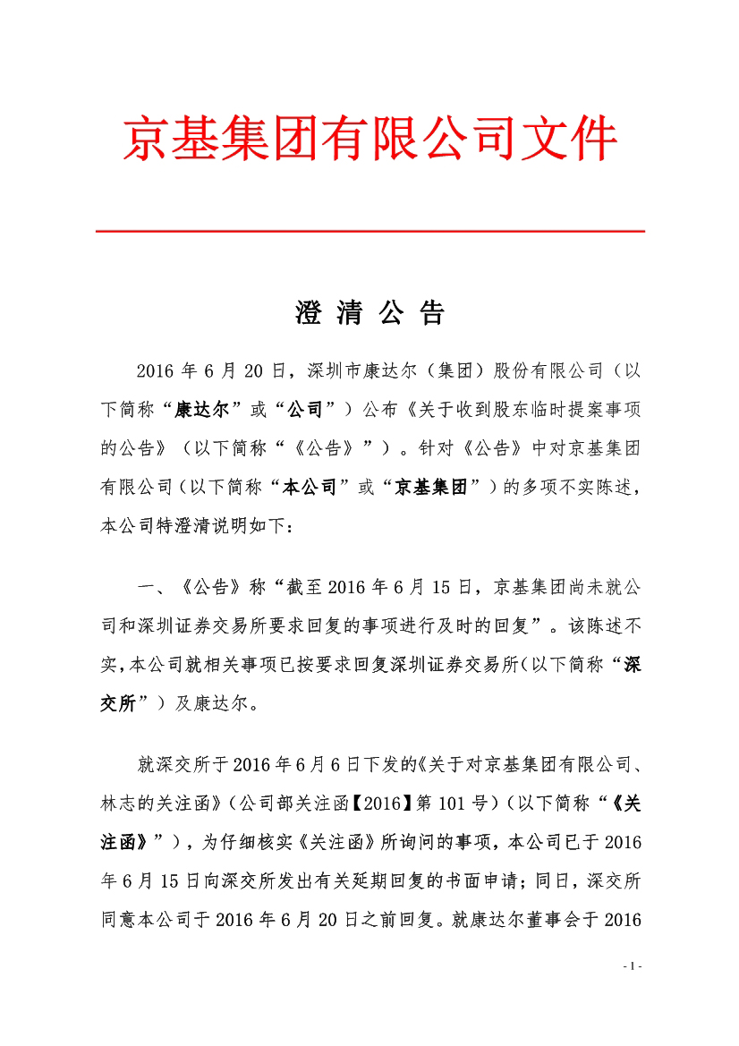 2016年6月20日,深圳市康达尔(集团)股份有限公司(以下简称“康达尔”或“公司”)公布《关于收到股东临时提案事项的公告》(以下简称“《公告》”)。针对《公告》中对京基集团有限公司(以下简称“本公司”或“京基集团”)的多项不实陈述,本公司特澄清说明如下: