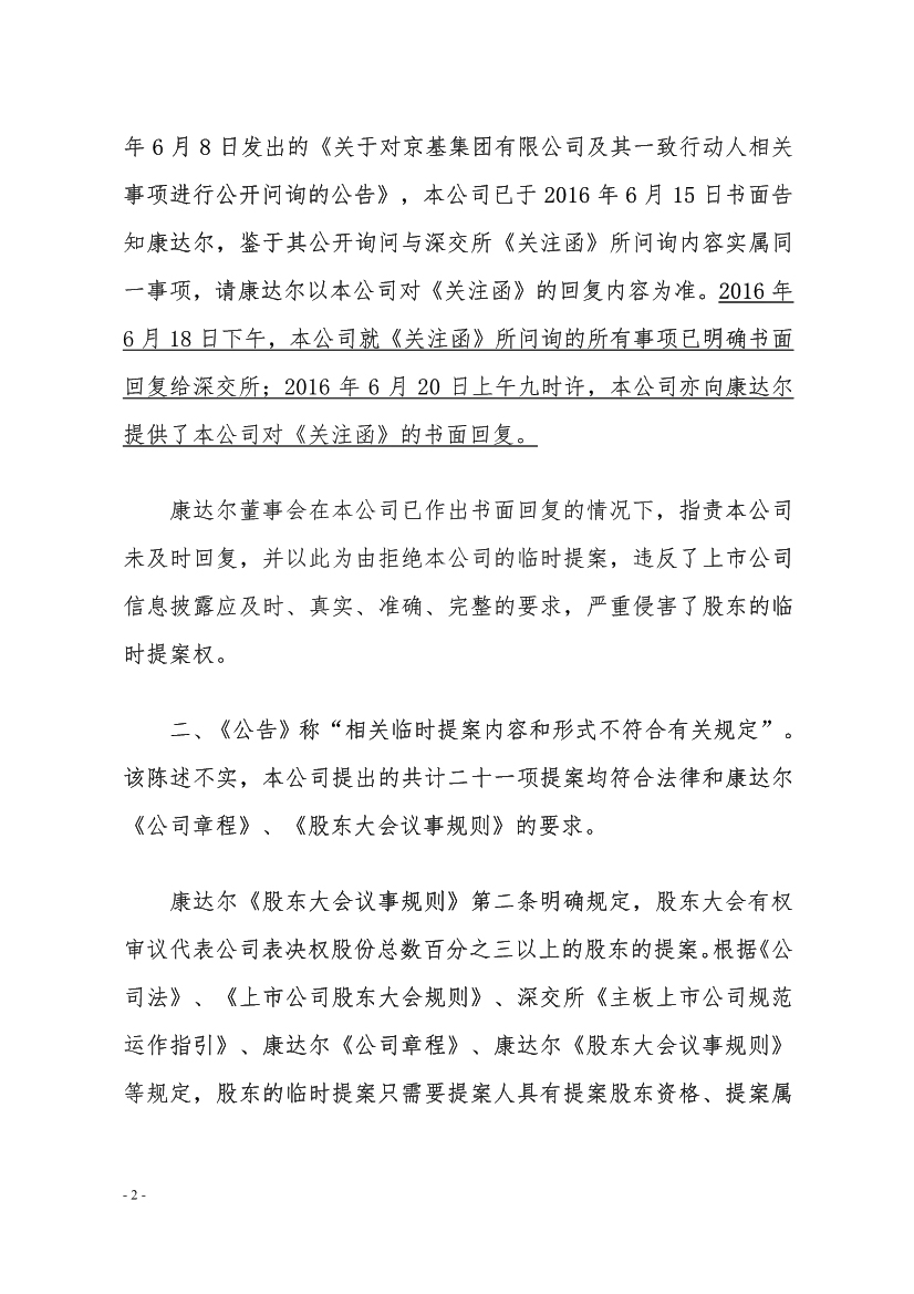 一、《公告》称“截至2016年6月15日,京基集团尚未就公司和深圳证券交易所要求回复的事项进行及时的回复”。该陈述不实,本公司就相关事项已按要求回复深圳证券交易所(以下简称“深交所”)及康达尔。