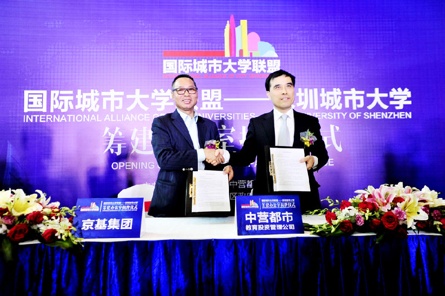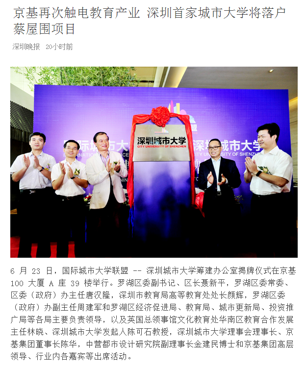 京基集团自 1994 年成立以来,经过二十多年的成长,现已发展成为集房地产开发与经营、商业开发与经营、酒店开发与经营、物业管理、餐饮经营与管理、金融资本运作、高尔夫、动画文化等八大领域的多元化、综合性集团。京基集团以深圳地标建筑 " 京基 100" 而闻名,所创造的 " 蔡屋围模式 " 成为深圳城市更新的典范之作,京基蔡屋围城市更新项目是其在罗湖区又一城市更新标杆性力作。该项目规划总建筑面积约 430 万平方米,包括超甲级写字楼、大型商业、高星级酒店、高端住宅、公寓、教育文化配套等多种业态,得到罗湖区委区政府的高度重视,目前正在有序推进中。国际城市大学联盟 -- 深圳城市大学并不是蔡屋围城市更新项目首次 " 触电 " 教育产业,早在 2013 年 5 月,京基集团就与普林斯顿教育中心和美国曼哈顿音乐学院签约,约定将学院的国际校址落户在该项目上。